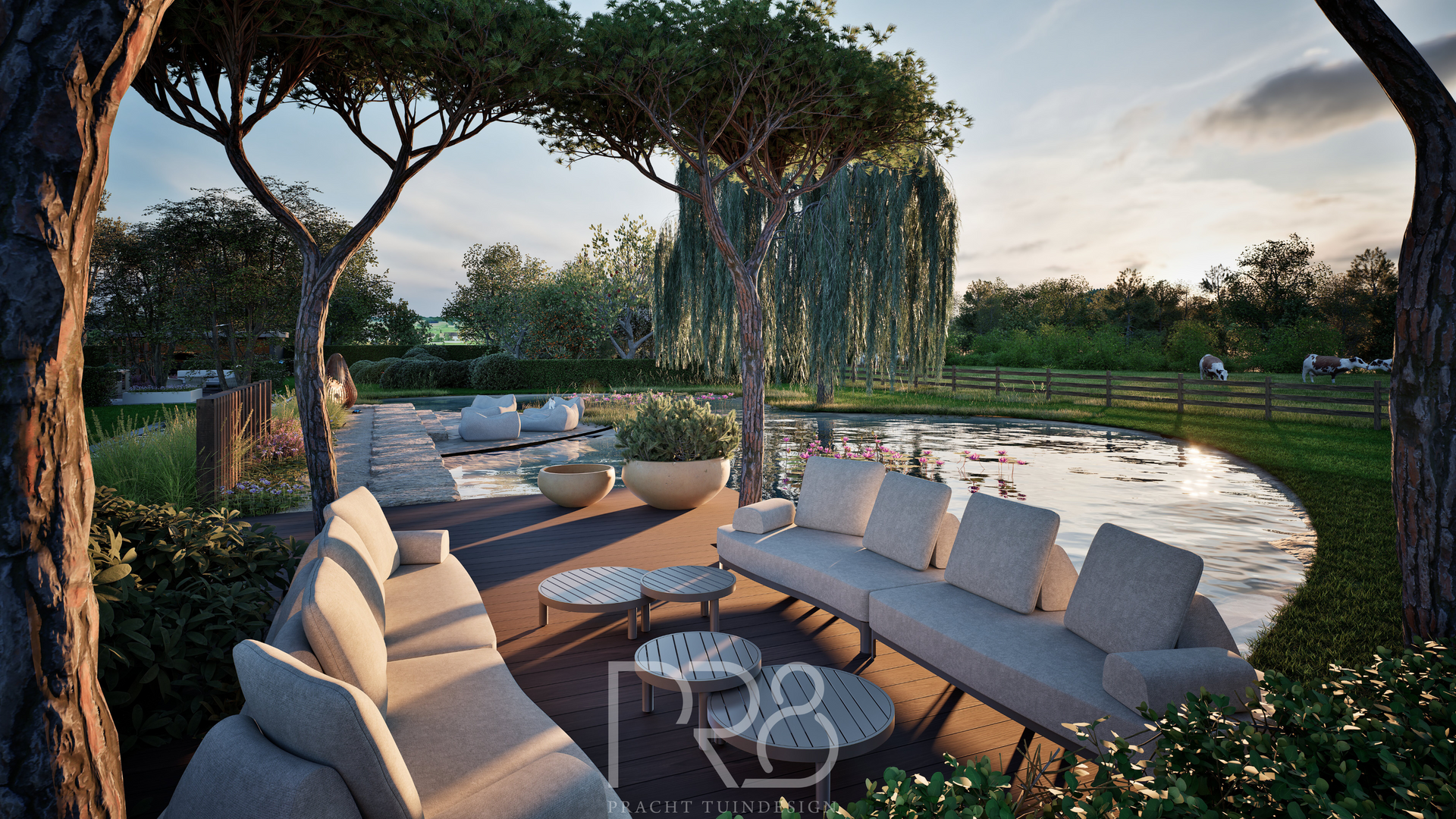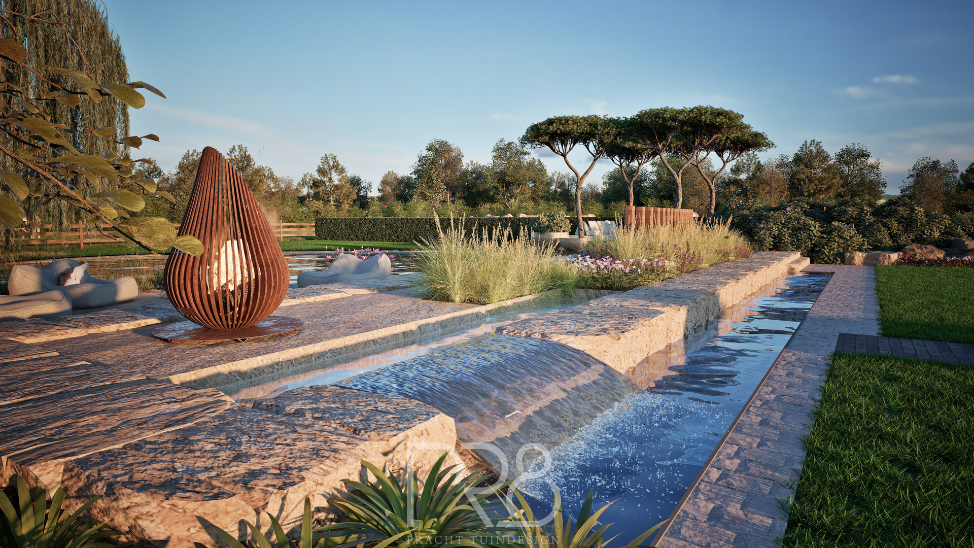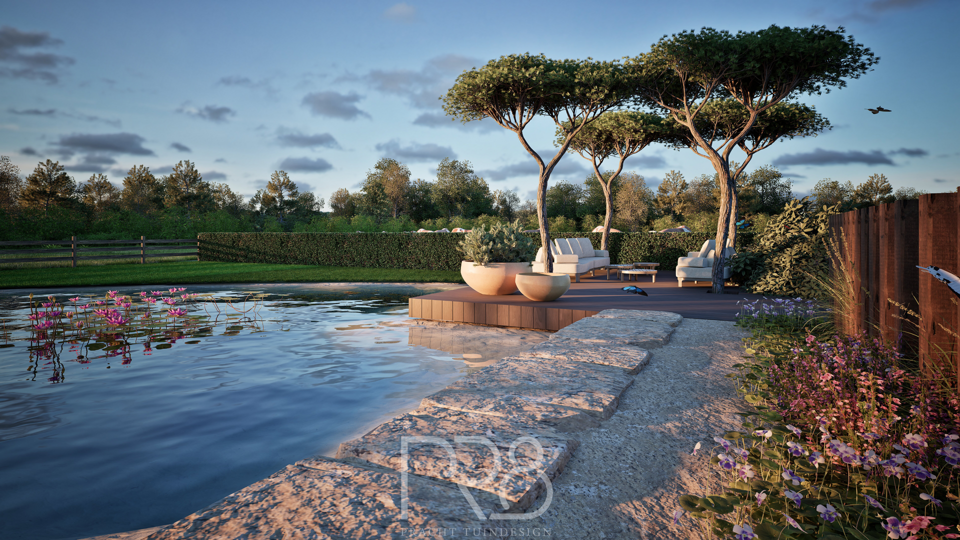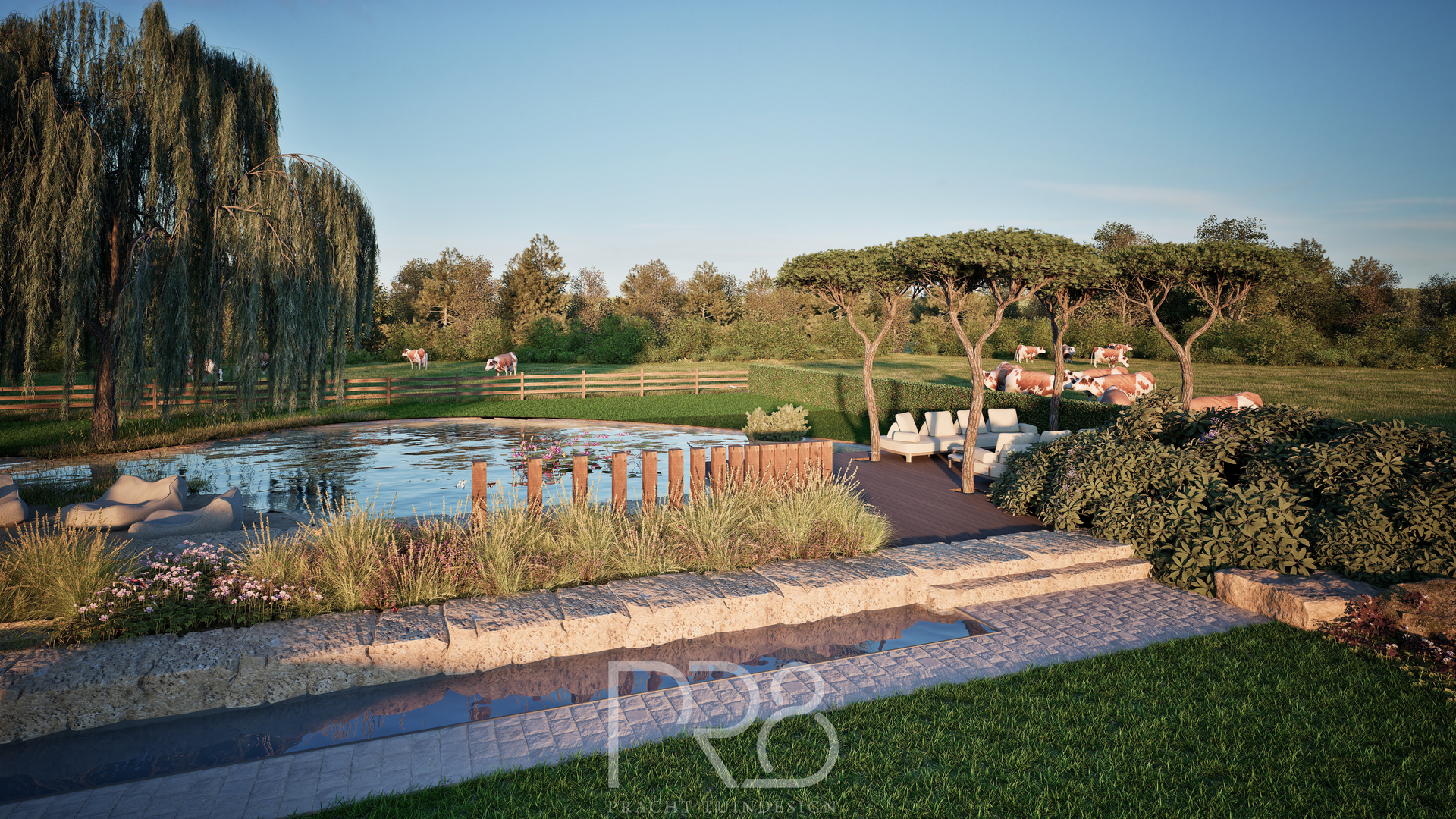 Deze prachtige landschapstuin gaat naadloos over in de omliggende bosrijke omgeving. De natuurlijke vijver, gecombineerd met robuuste materialen zoals natuursteen, creëert een serene sfeer. Dankzij de knusse hoekjes kunt u op verschillende plekken genieten van zowel de zonsopgang als de zonsondergang, terwijl een sfeervol vuurpunt niet alleen warmte biedt, maar ook als echte blikvanger fungeert.