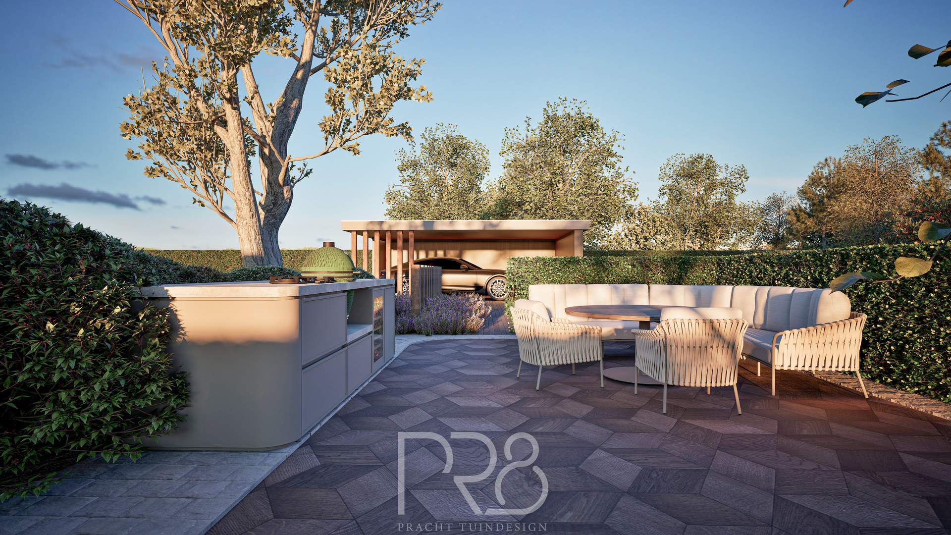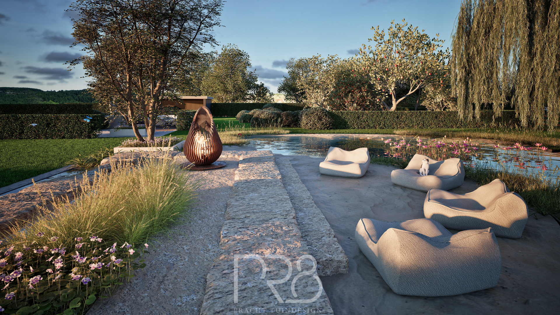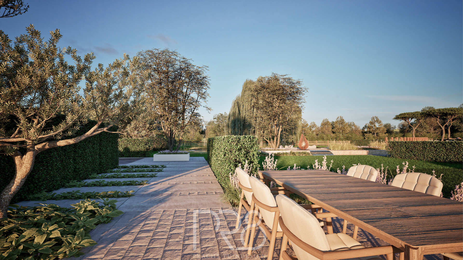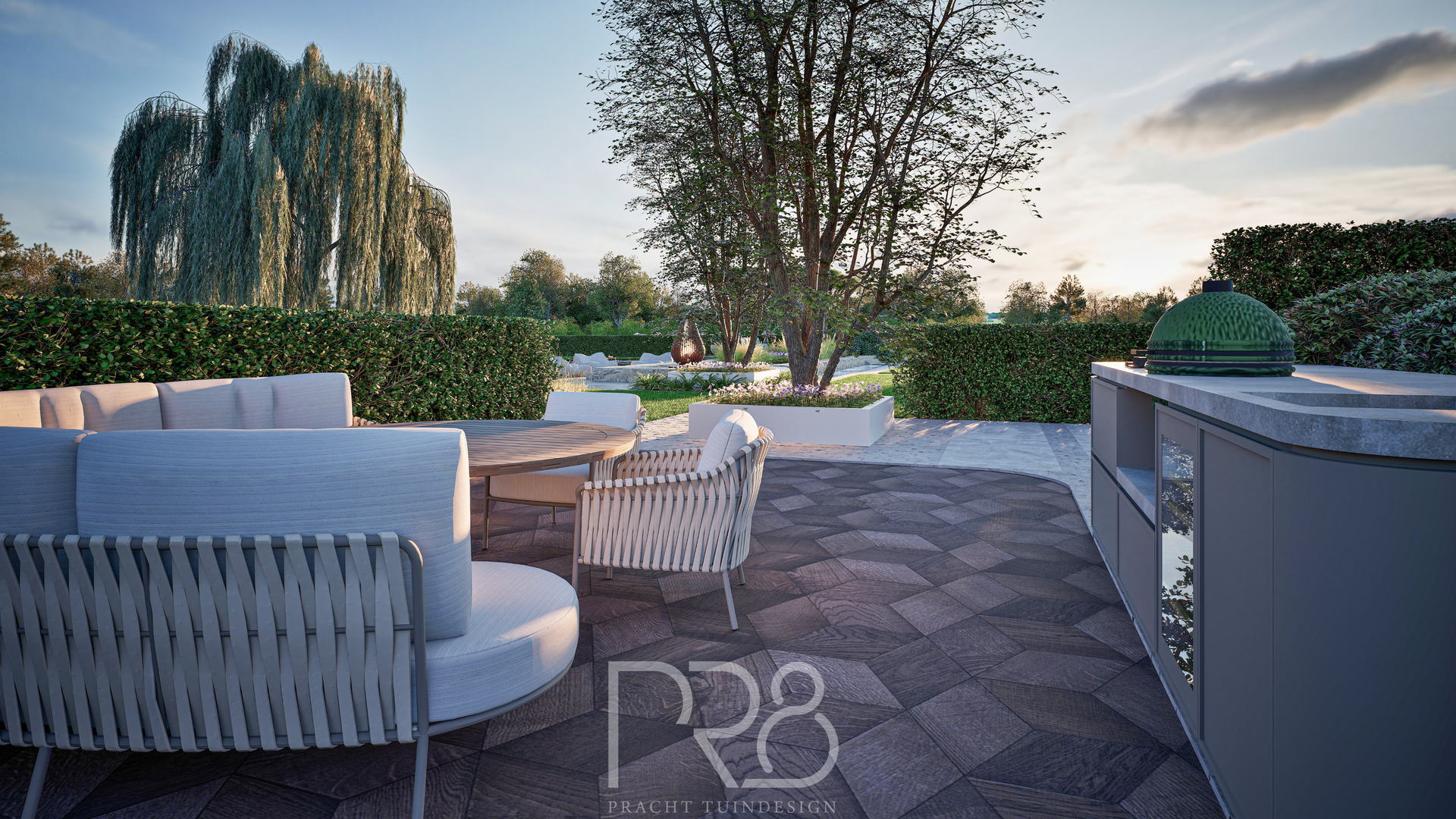Deze prachtige landschapstuin gaat naadloos over in de omliggende bosrijke omgeving. De natuurlijke vijver, gecombineerd met robuuste materialen zoals natuursteen, creëert een serene sfeer. Dankzij de knusse hoekjes kunt u op verschillende plekken genieten van zowel de zonsopgang als de zonsondergang, terwijl een sfeervol vuurpunt niet alleen warmte biedt, maar ook als echte blikvanger fungeert.