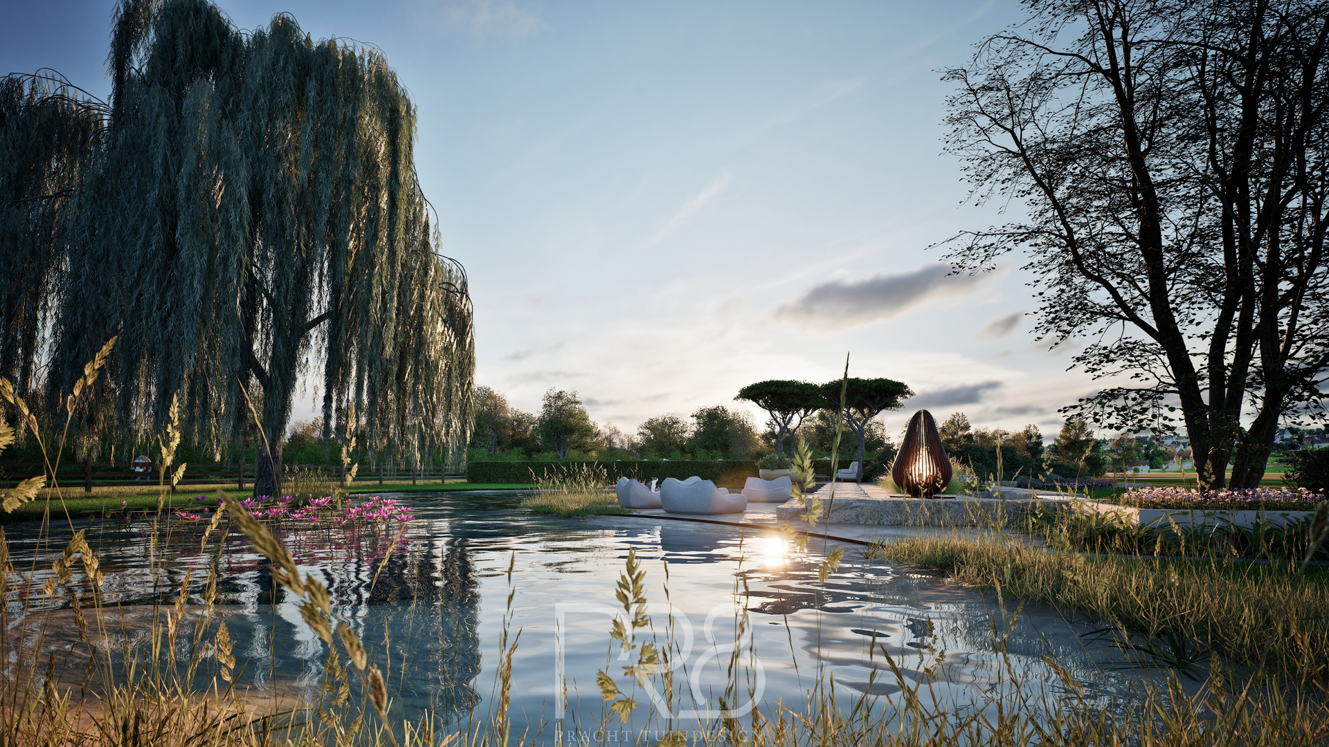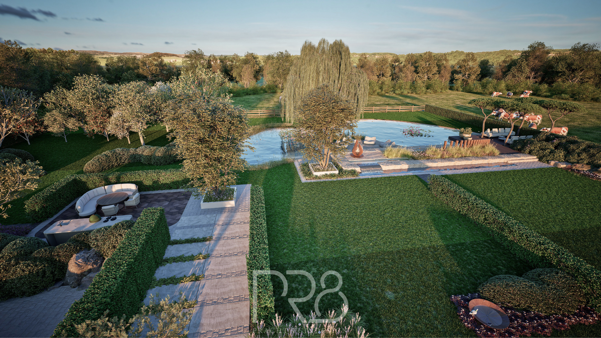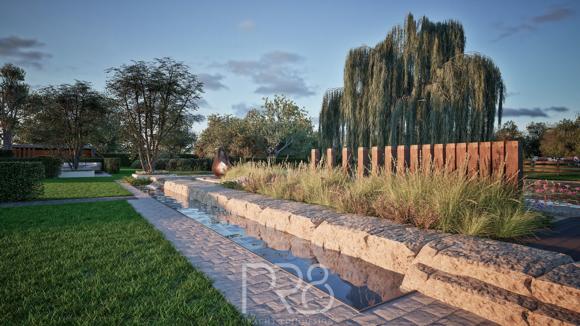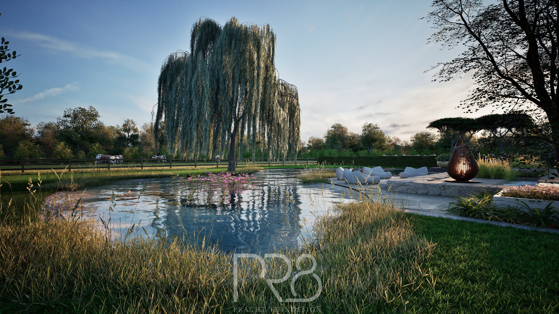 Deze prachtige landschapstuin gaat naadloos over in de omliggende bosrijke omgeving. De natuurlijke vijver, gecombineerd met robuuste materialen zoals natuursteen, creëert een serene sfeer. Dankzij de knusse hoekjes kunt u op verschillende plekken genieten van zowel de zonsopgang als de zonsondergang, terwijl een sfeervol vuurpunt niet alleen warmte biedt, maar ook als echte blikvanger fungeert.